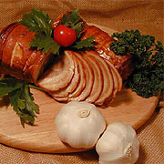 豚のばら肉を特製のたれに漬け込み、糸で整えたあと高温で直火焼きした焼き豚です。
