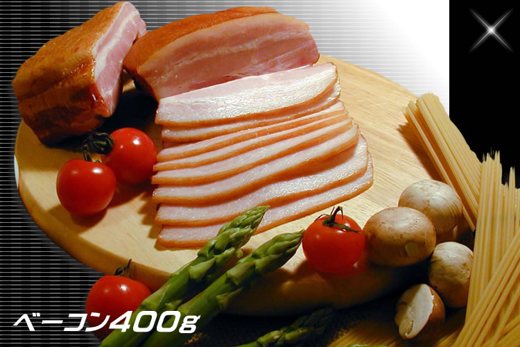 ★約4kgの一枚のベーコンから職人が400gにカットします |