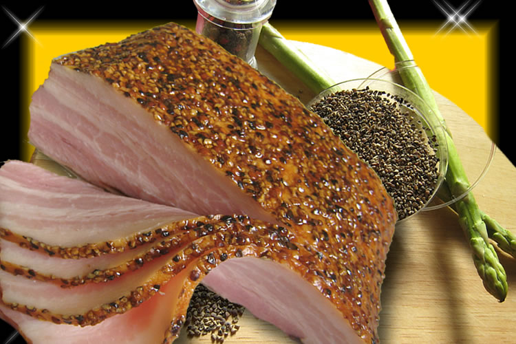 ベーコン「塊」400gに超粗引きのブラック・ペッパーをまぶし、じっくりスモークをかけて丁寧にお造りました。